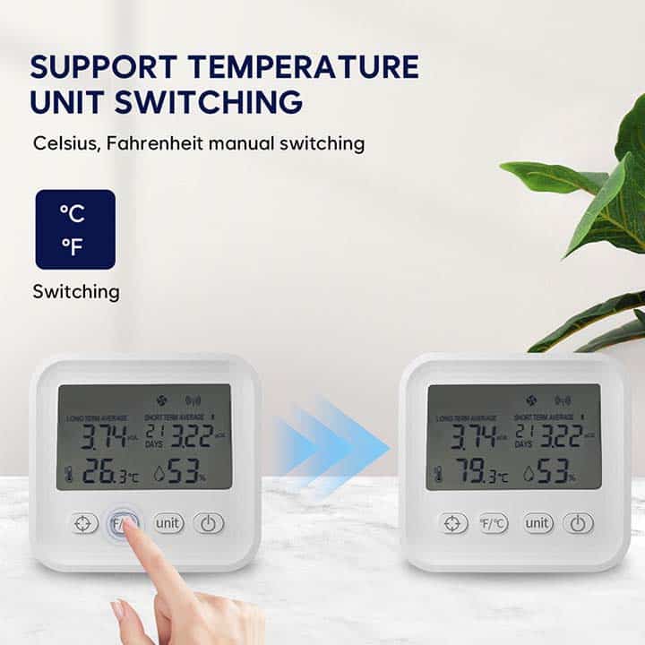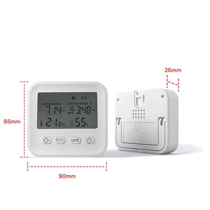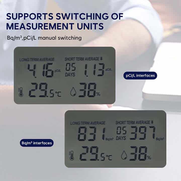 In addition to detecting radon gas, it has a temperature indicator and shows the percentage of ambient humidity.
