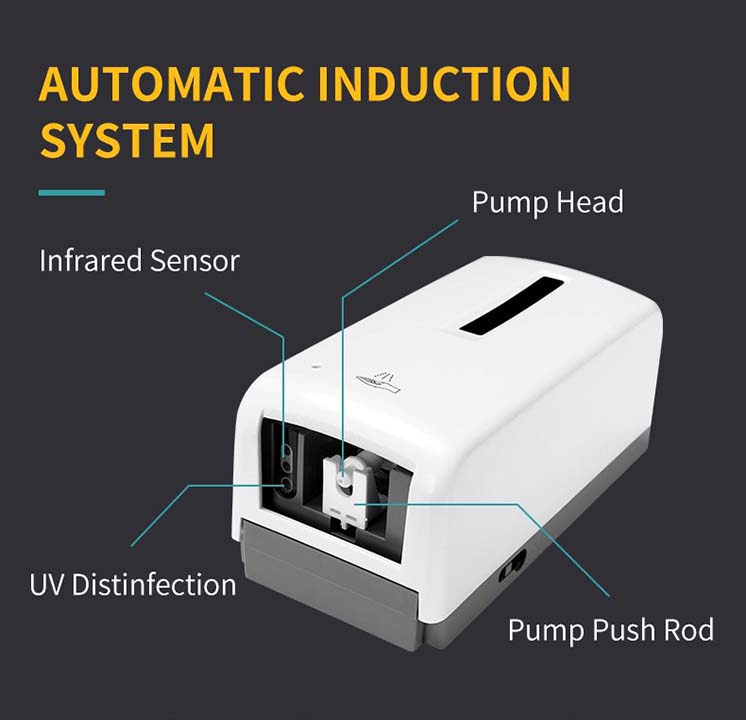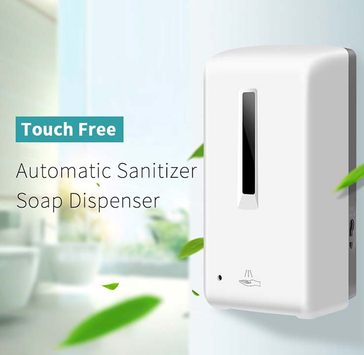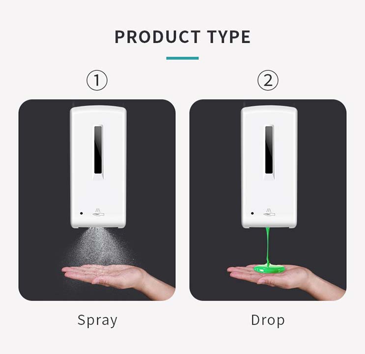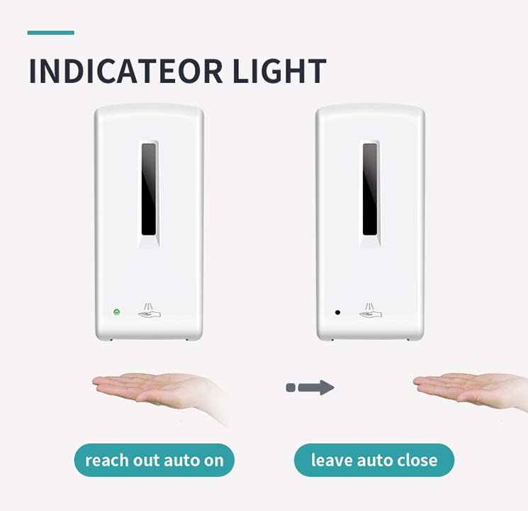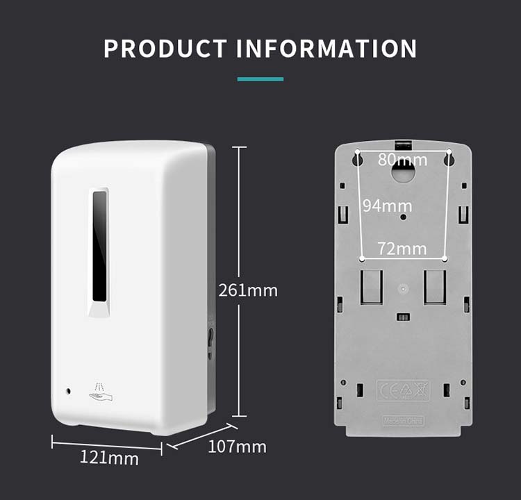 This soap dispenser can contain up to 1 liter of liquid soap or hydroalcholic gel in its rechargeable bottle, allowing for a prolonged use. It is equipped with an anti-drip valve to prevent wasting supplies, and it supplies a selectable output of 0.8-1ml / per dose.