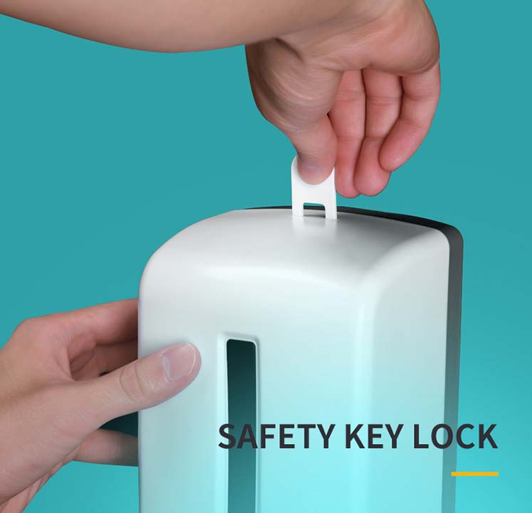 Its external body is made of white ABS material and gives the dispenser a unique and eye-catching design. The set consists of a plastic lock and key to facilitate the replacement of consumables, protecting it from misuse.