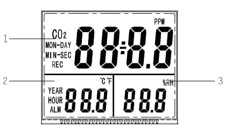 • The LCD displays and simultaneously records CO2 levels, temperature, relative humidity, calendar (A/M/D) and time (clock)