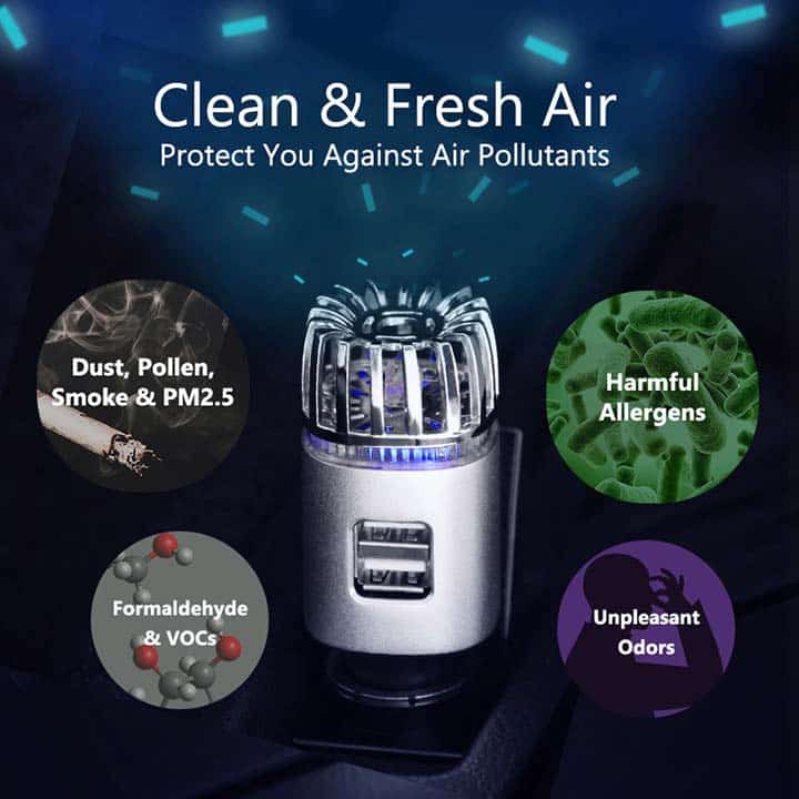 It charges the car’s environment with healthy and protective negative ions that minimize potential virus and bacterial infections: