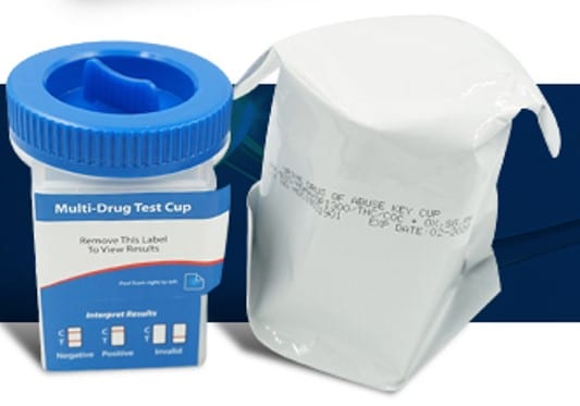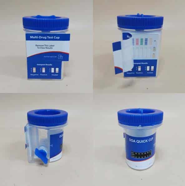 Multi-drug urine test with container, timer and thermometer.