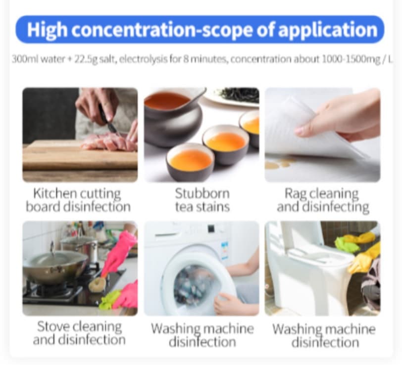 • Compared to bottled disinfectant: homemade hypochlorous acid disinfectant can directly use edible salt and water as raw material, which is safer and healthier.