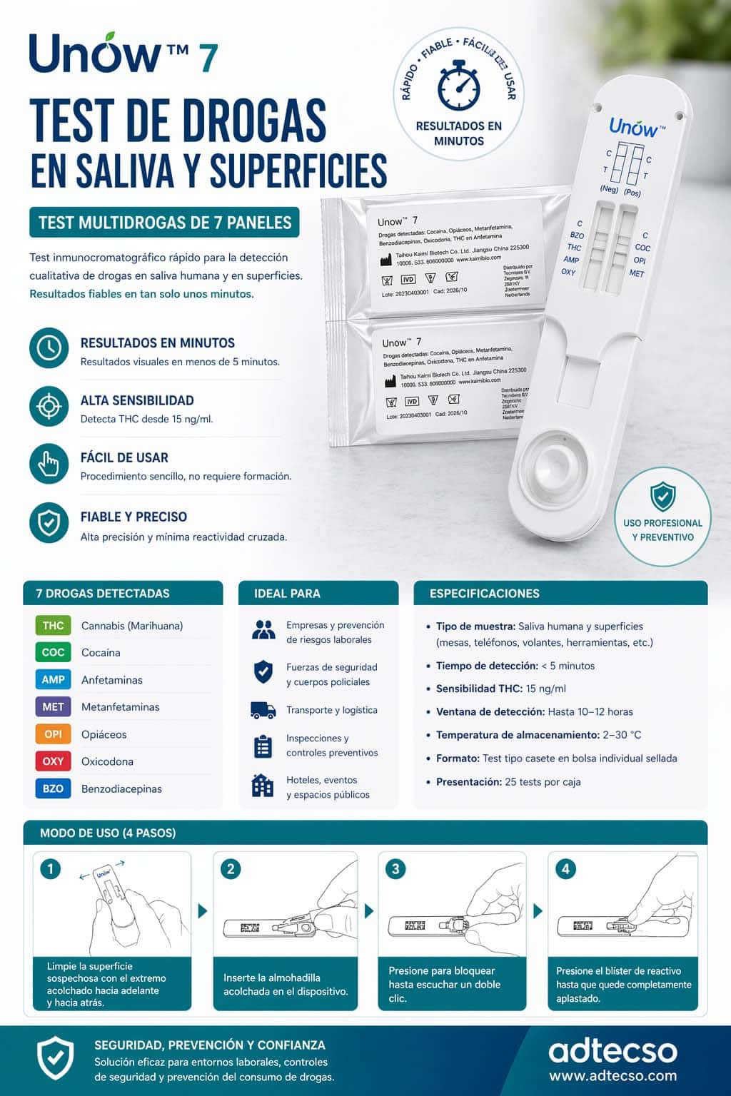 With the Unow™ 7-panel Multidrug Saliva Test.: BZO 10/ THC15/ AMP 50/ OXY 40/ COC 50/ OPI 50/ MET 50 you can easily and quickly if check a person has consumed any drugs in the last few hours. This multidrug test: