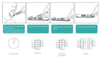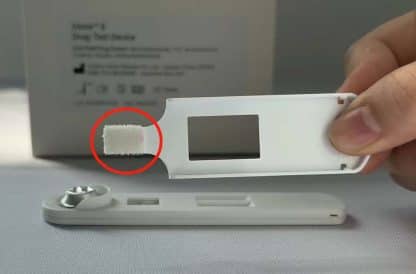 Performing the test manually is very simple. Simply insert the swab into the person’s mouth to collect a saliva sample and then place it on the cartridge. Thanks to the solution it contains and its reaction, it will show in a few minutes (through a legend) whether the test is positive or negative for all types of drugs.