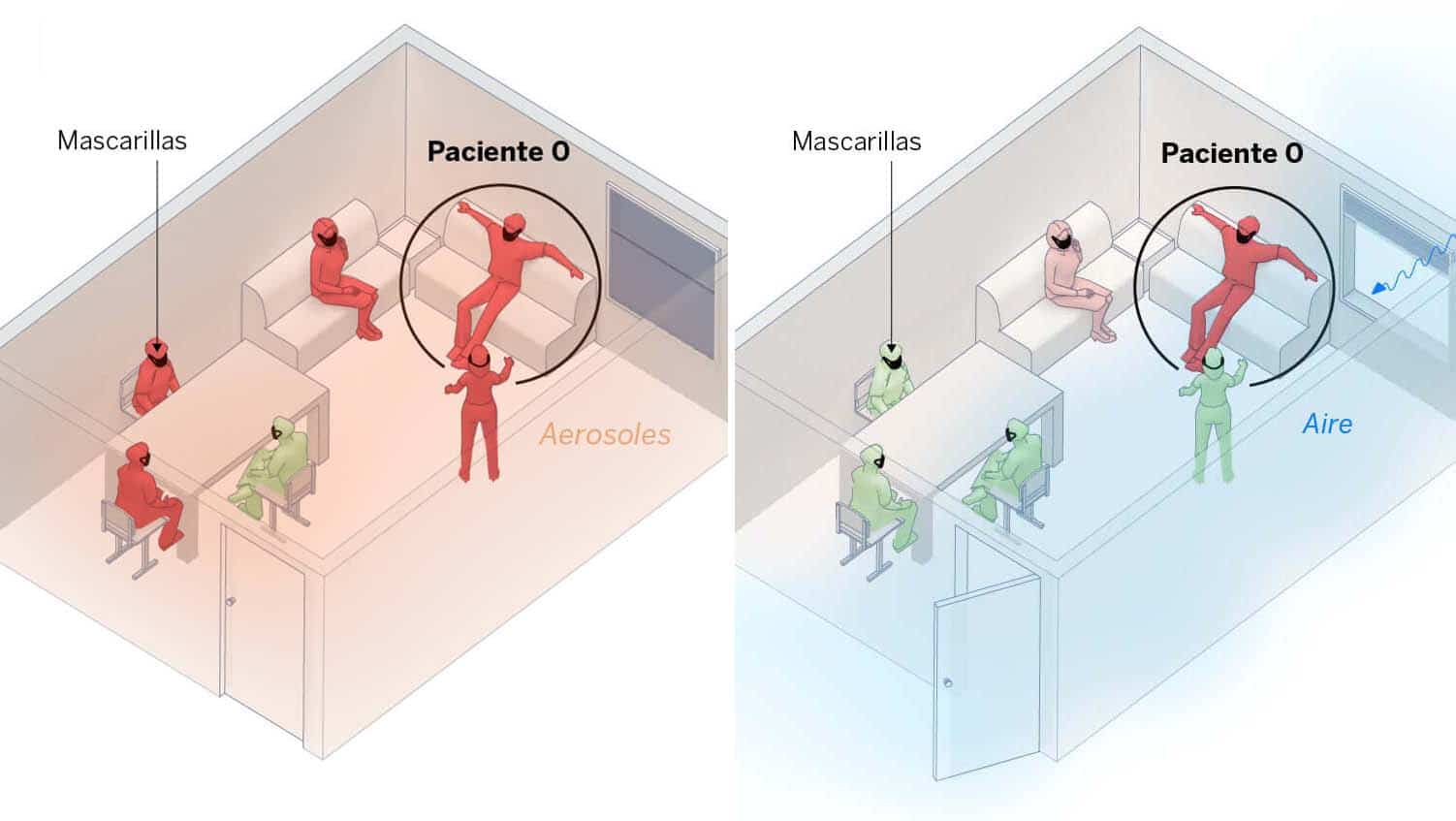 Si una persona contagiada de COVID, o gripe, permanece durante horas hablando, tosiendo, incluso respirando en un recinto cerrado, el ambiente se irá llenado de aerosoles infecciosos.