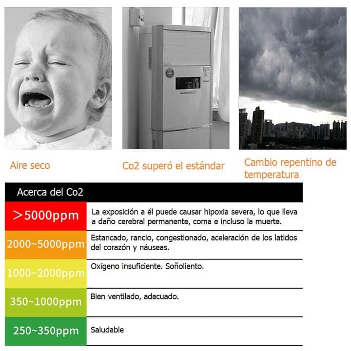 - Alcance de medición de dióxido de carbono: 0 ~ 9999PPM Precisión: ± 70ppm ± 3% lecturas (0 ~ 5000)