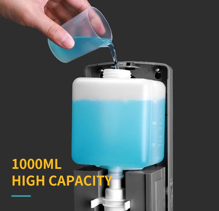 Este dispensador de jabón puede contener hasta 1 litro de jabón líquido o gel hidroalchólico en su botella recargable, lo que permite un uso prolongado. Está equipado con una válvula anti goteo para evitar el desperdicio de consumibles y permite una salida seleccionable de  0.8-1ml / por dosis.