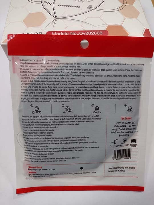 Instrucciones de uso: Lavar manos con agua y jabón. Sujetar la mascarilla desde las bandas de ajuste y colocar sobre nariz y boca. Fijar las bandas de sujeción tras las orejas. Si fuera necesario, colocar y ajustar la banda metálica que se proporciona sobre la nariz. Para retirarla, siempre desde las bandas de sujeción, no toque la parte delantera. Deseche la mascarilla y lávese las manos de nuevo.