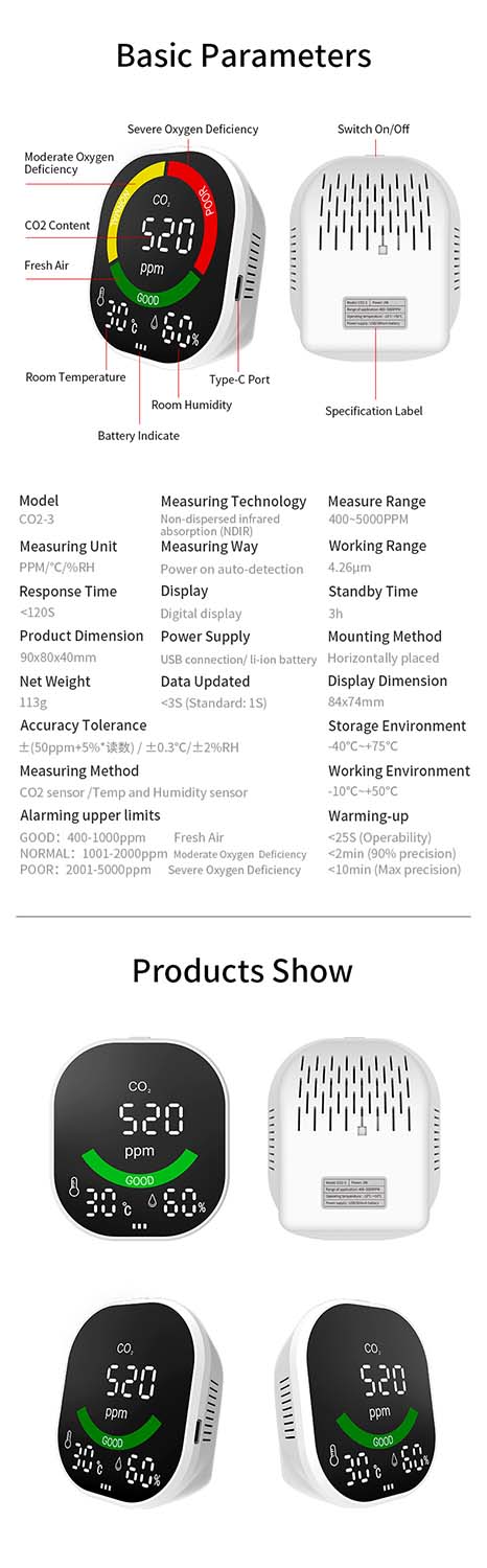 El Monitor de CO2 CDP-CO2-3 es un dispositivo homologado por la CE, de alta precisión y diseño tanto para uso portátil como fijo. Se utiliza para detectar la concentración de dióxido de carbono, temperatura y humedad en el ambiente.