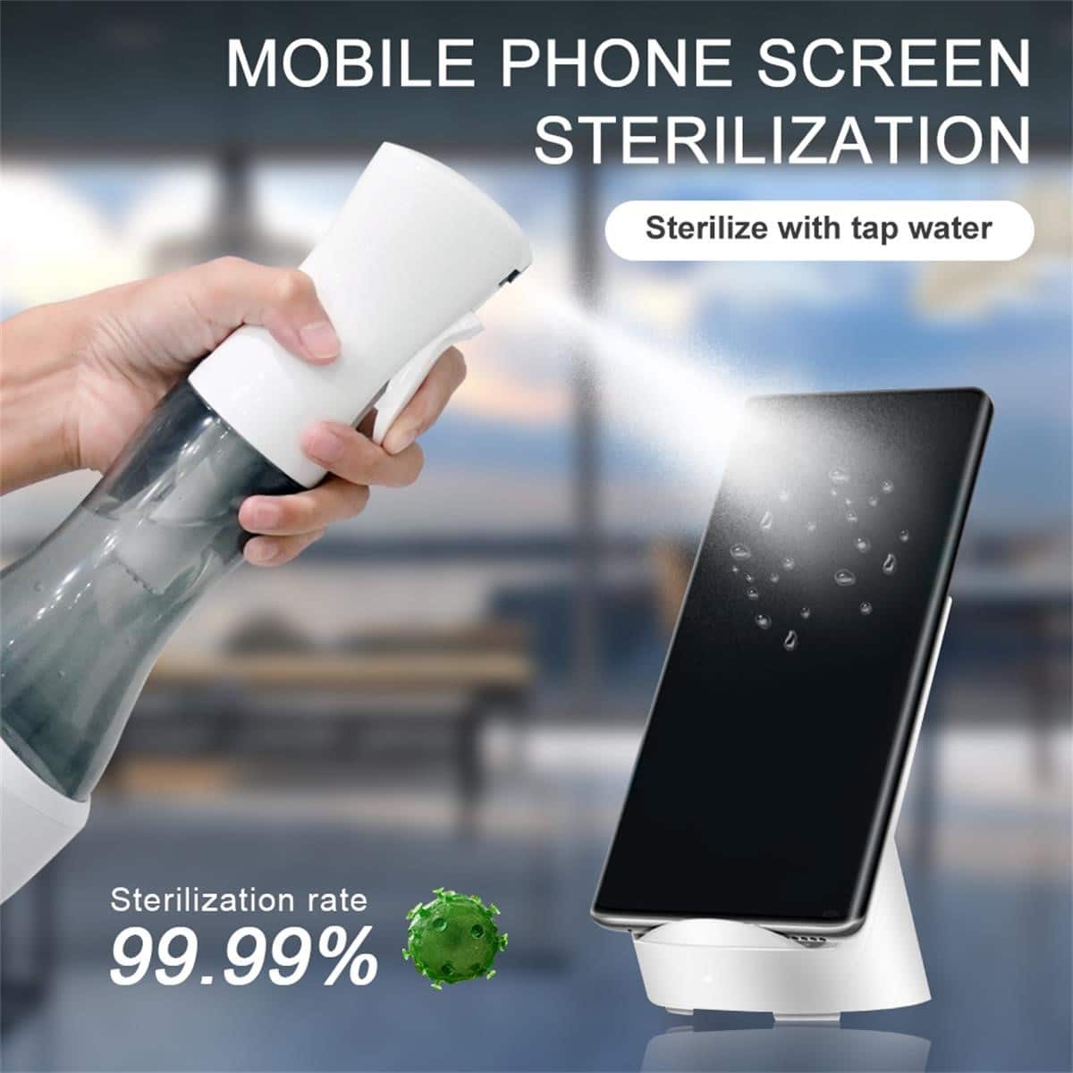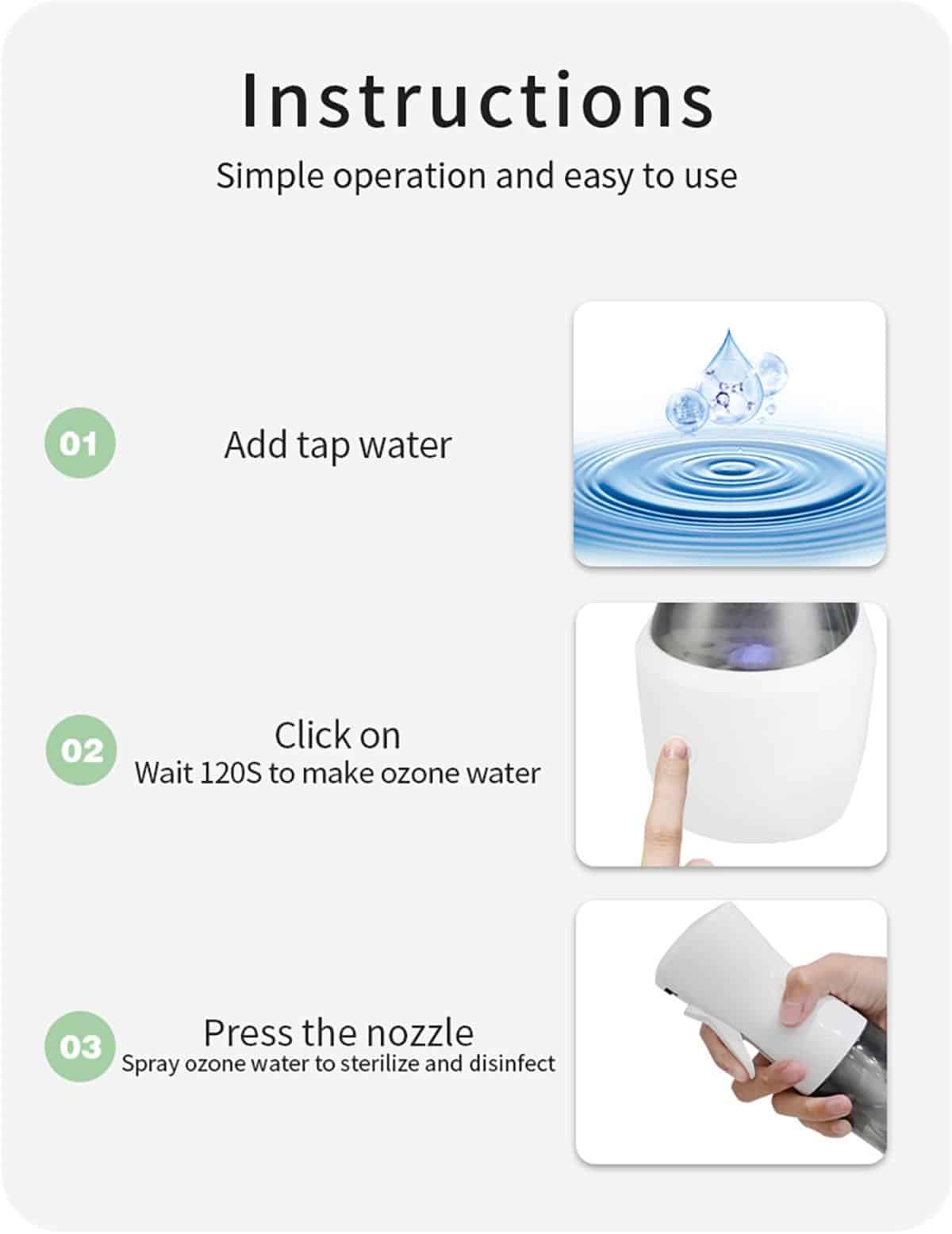Con esta botella-espray desinfectante por agua ozonizada (O₃), solo necesitará añadir agua para producir una alta concentración de ozono para desinfectar y esterilizar completamente cualquier tipo de superficie. Su tasa de esterilización probada es del 99.99% contra E. Coli y Staphylococcus aureus.
