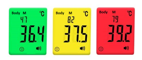 LUZ DE FONDO TRICOLOR con ALARMA DE FIEBRE: Pantalla grande retro iluminada de 3 colores y alarma de fiebre que indica temperatura normal, elevada y fiebre respectivamente en modo cuerpo; Verde 35~37.5°C, Amarillo 37.5~39°C, Rojo 39°C~42.0°C