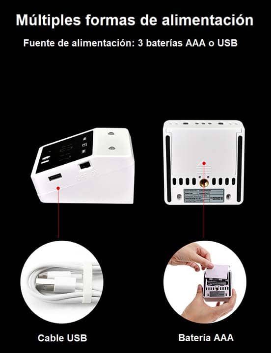 - Alimentación: 3 pilas AAA / USB 5V1A
