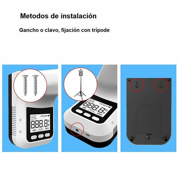 - Termómetro infrarrojo inteligente para la frente, sin necesidad de sostenerlo, se puede colgar / soporte fijo en tripode, etc.
